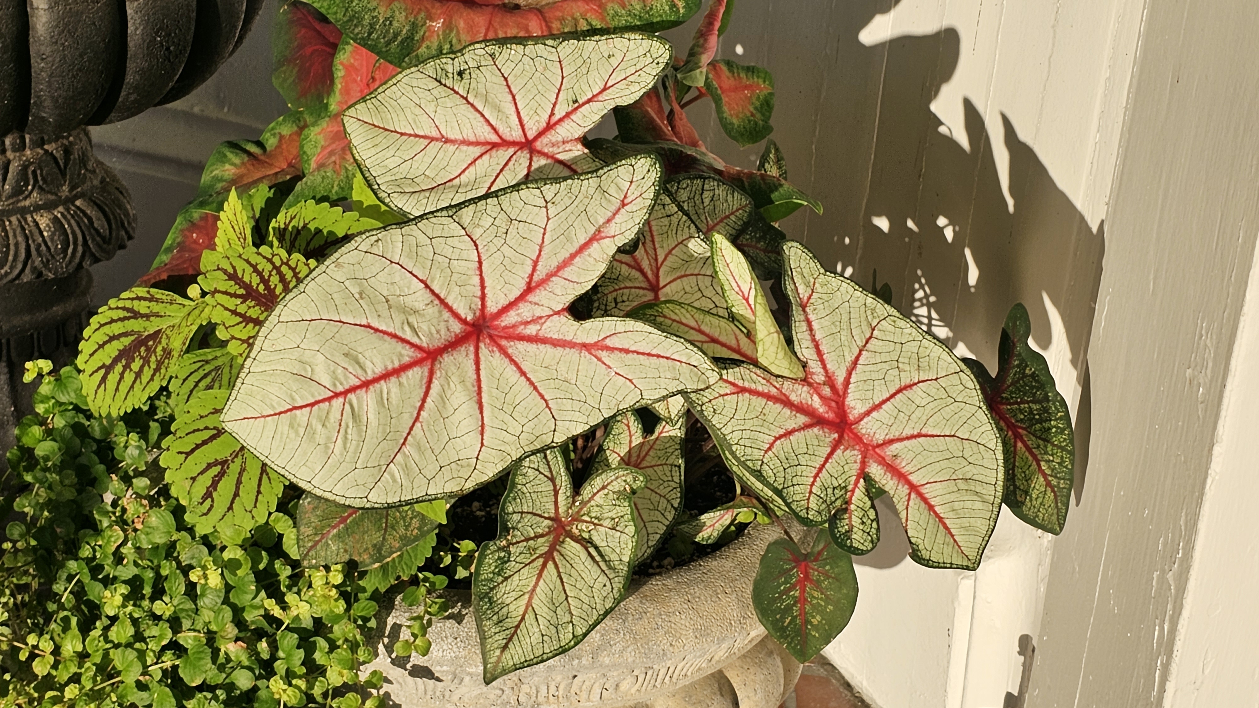 Caladium ‘White Queen’ partners with coleus and creeping Jenny for dappled porch light, showcasing foliage-first design.