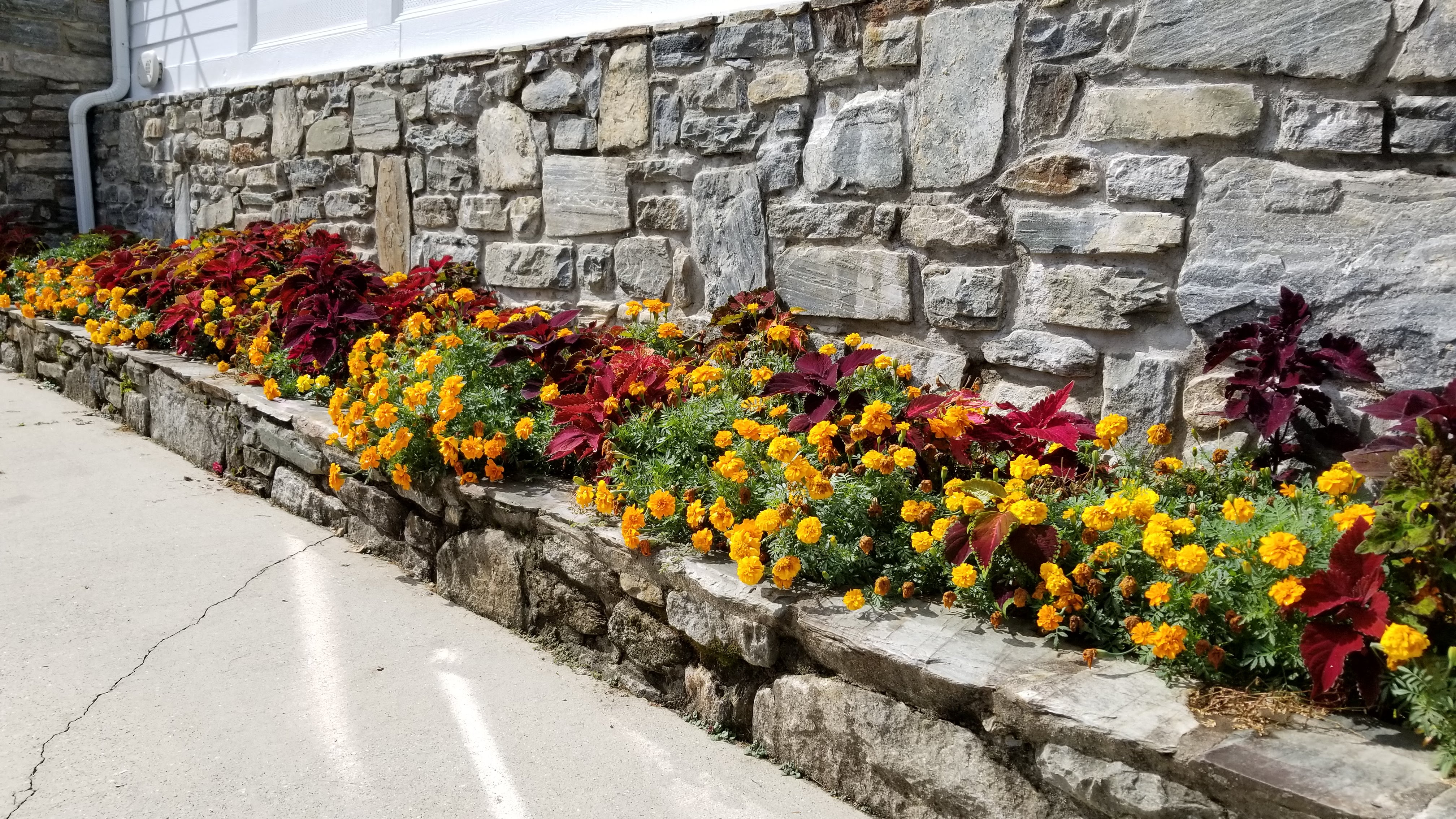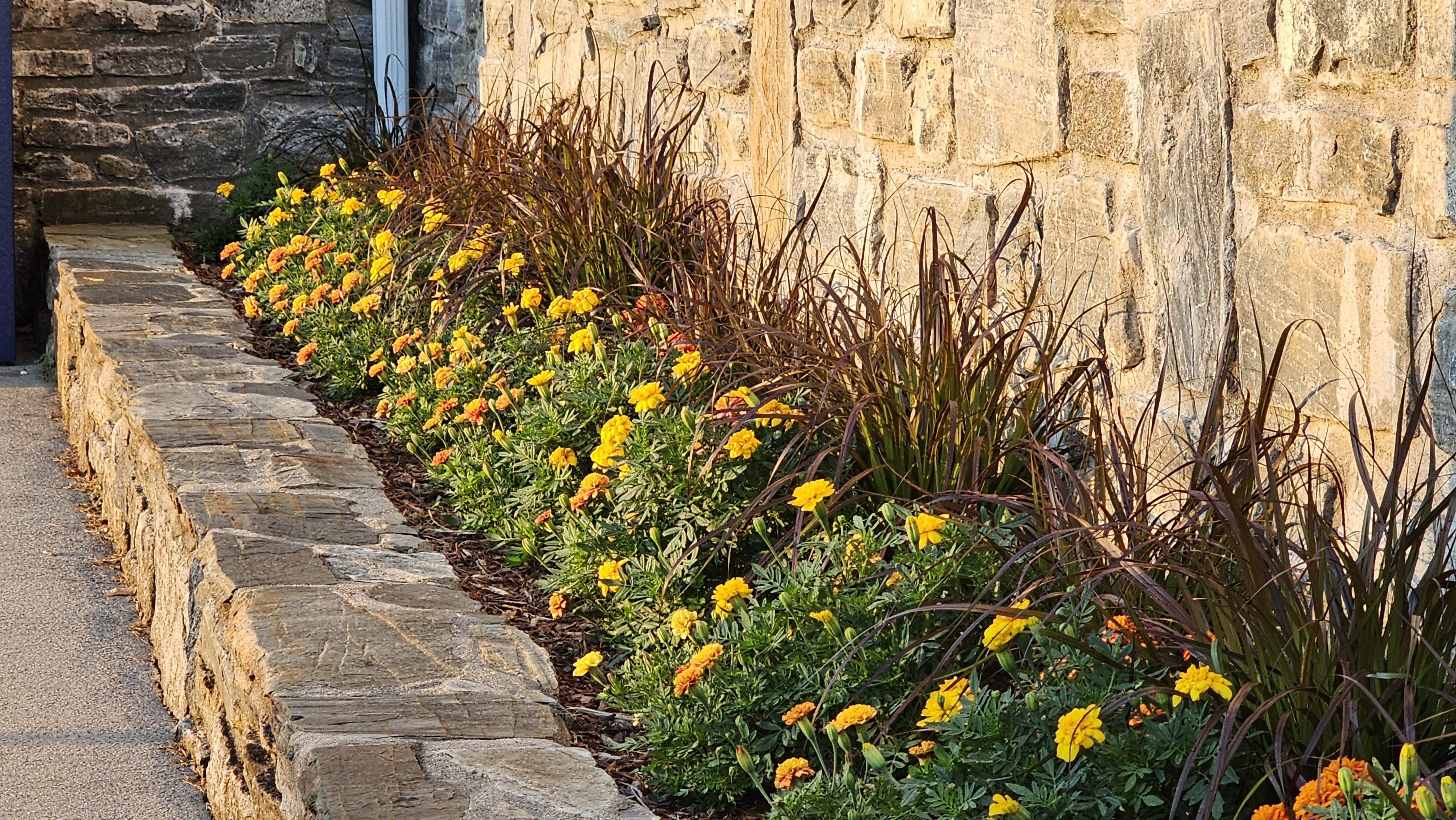 Golden marigolds and burgundy coleus spill over hand-built stone, illustrating how we lean on foliage contrast to anchor a long-lasting seasonal edge.