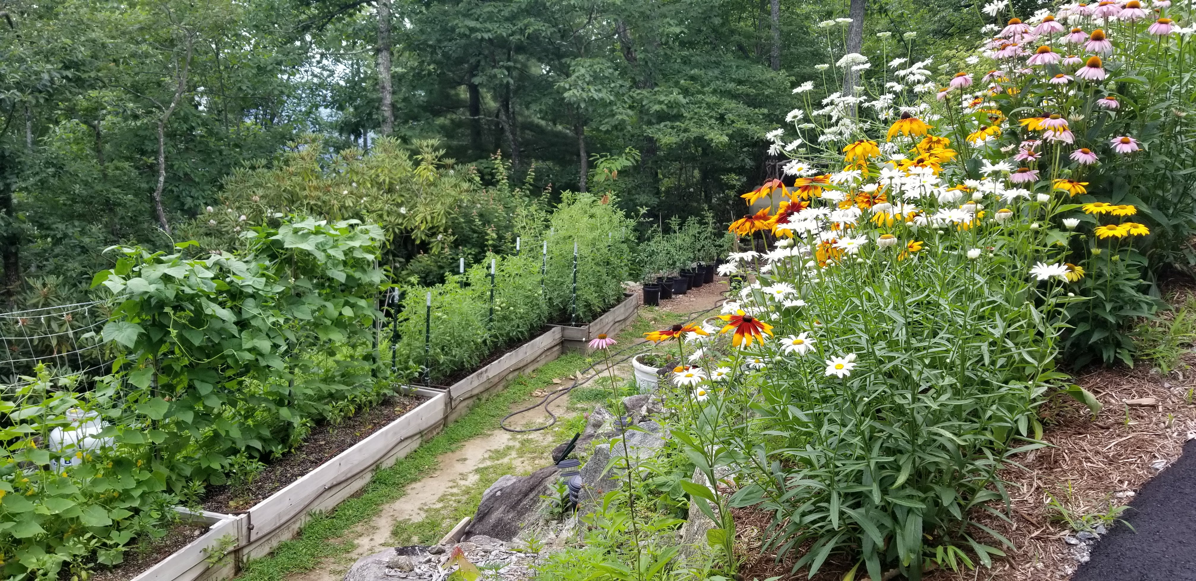 Trellised cucumbers and tomatoes share the stage with coneflowers and Rudbeckia, showing how food and flowers can co-exist in one lush hillside.