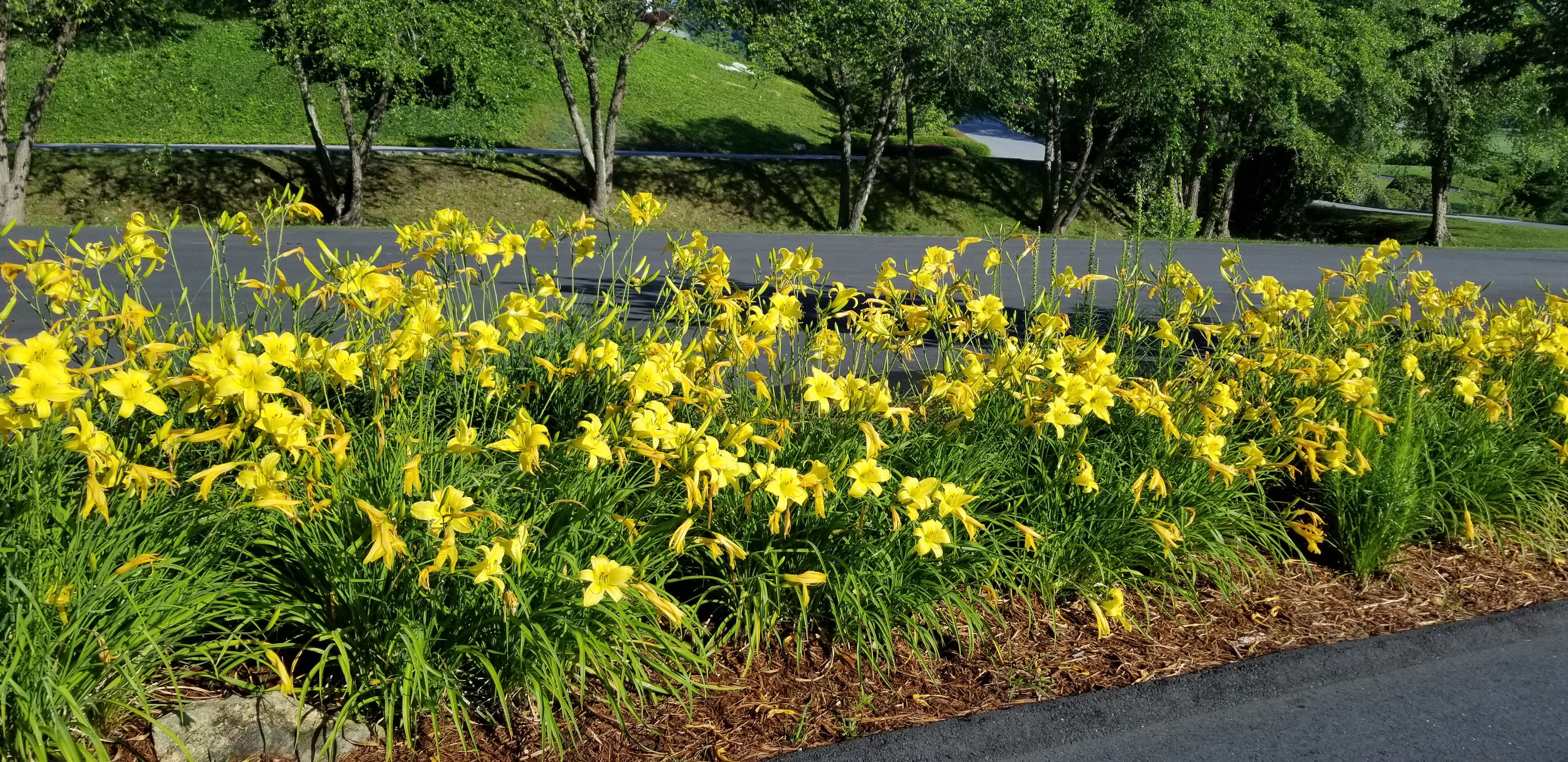 Daylilies massed along a roadside berm create living sunshine—proof of how repetition and rhythm elevate everyday slopes.
