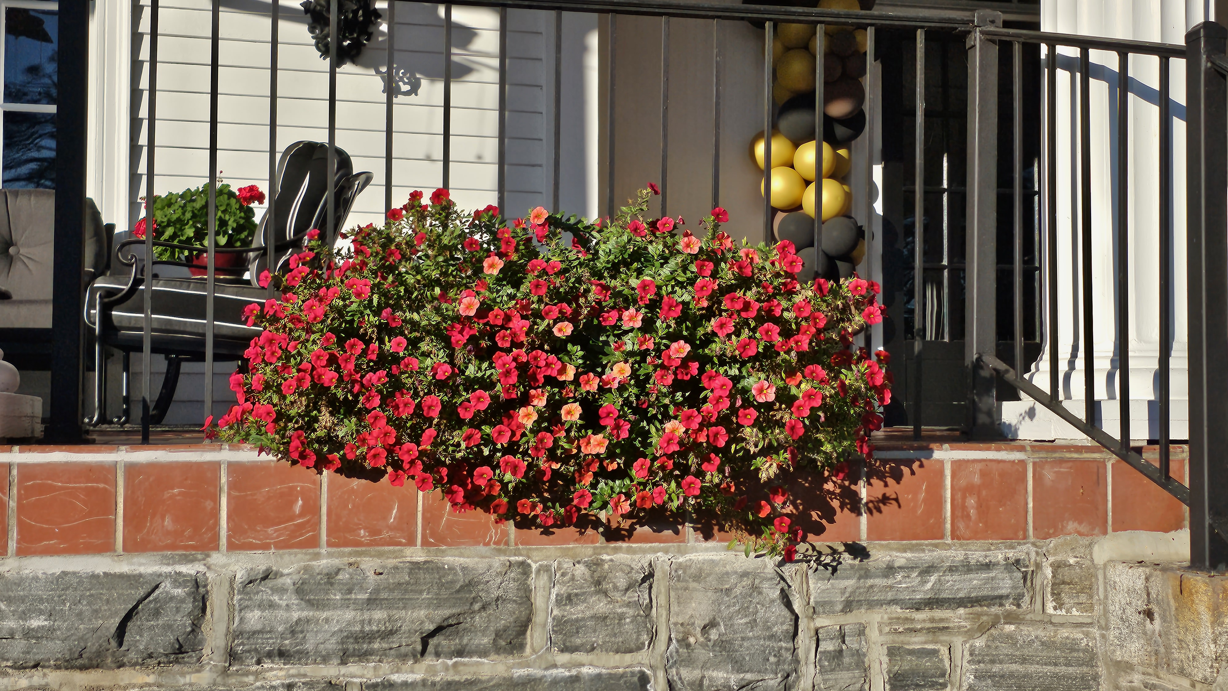 Calibrachoa in coral and ember hues cascade over a stone balcony, ideal for clients who want color without sacrificing architecture.