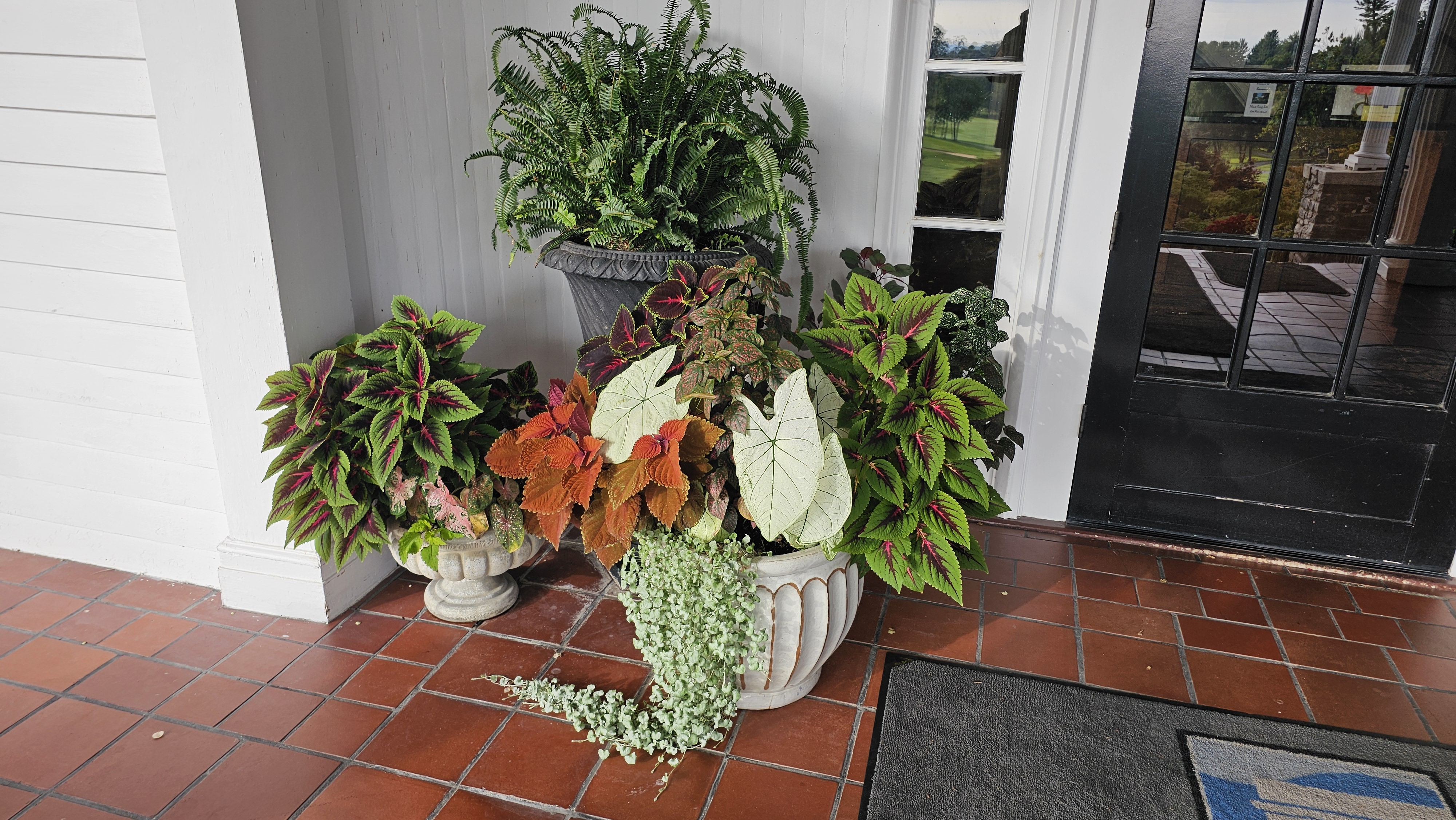 Boston fern, coleus, caladium, and creeping Jenny create a foyer of foliage—welcoming guests with texture over flash.